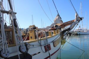 In banchina invece ritroviamo una vecchia conoscenza: Pandora, gestita dall’associazione Vela Tradizionale. Abbiamo avuto l’onore di salire a bordo qualche mese fa per visitare le borgate del Palio del Golfo. A Viareggio, tra le altre imbarcazioni, si distingue per l’inconfondibile armo che non prevede alcun tipo di manovra meccanizzata ma solo paranchi semplici, doppi e tripli per regolare le vele. Ogni suo dettaglio è un pezzo d’artigianato unico capace di raccontare storie incredibili a chi ha la voglia di fermarsi un istante ad ascoltarle.
