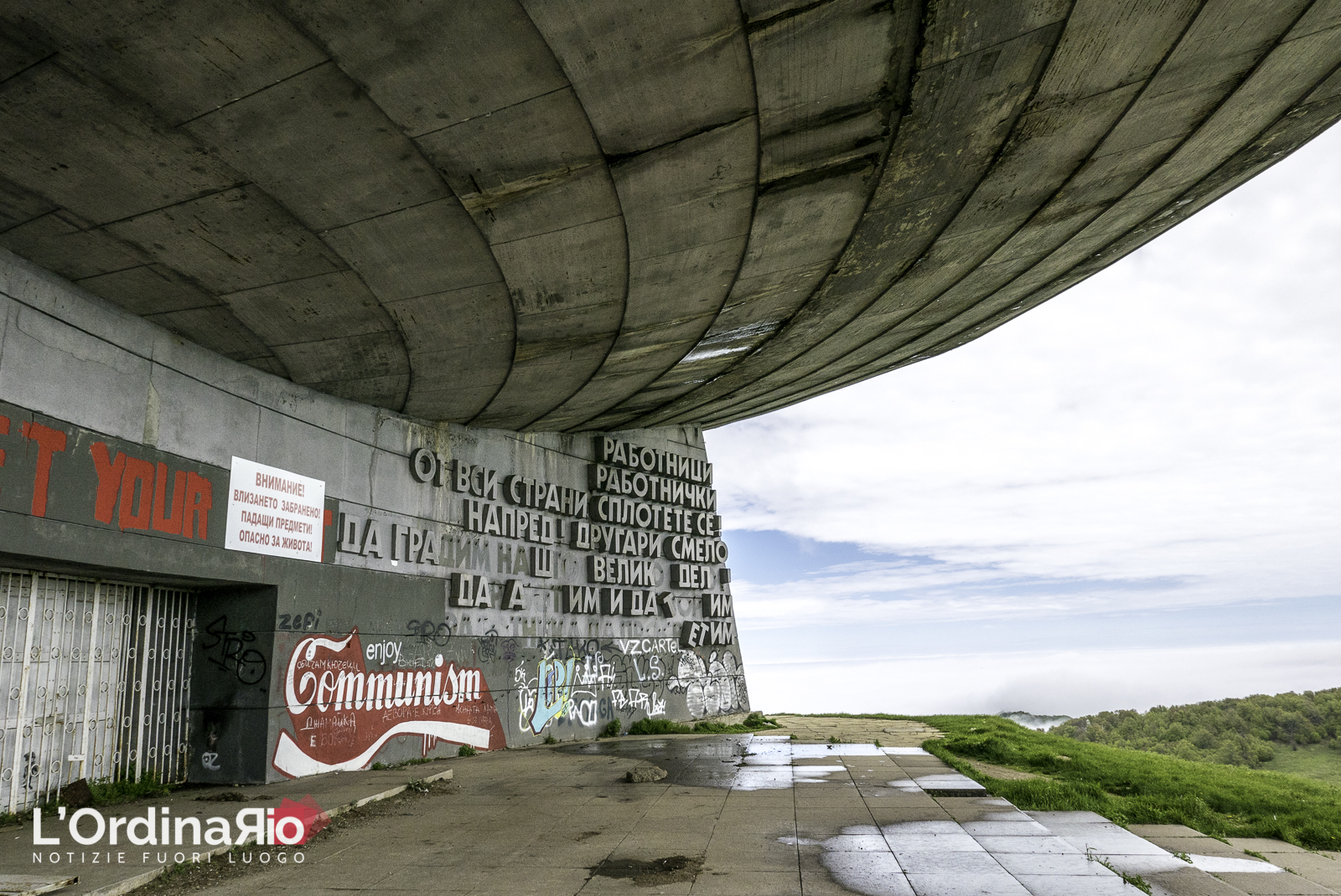 Dalla data della battaglia, il monte Buzludzha è rimasto “sacro” per i Bulgari. Fu quindi scontata, un secolo dopo, la scelta di questo luogo per la costruzione di un memoriale. I lavori iniziarono il 23 gennaio 1974 su progetto dell’architetto Georgi Stoilov. Per 7 anni più di 6000 persone contribuirono alla realizzazione. Singolare la modalità di reperimento dei finanziamenti per la costruzione, raccolti grazie a donazioni spontanee della popolazione e alla vendita di francobolli e souvenir. Praticamente una campagna di crowdfunding ante litteram. Il 23 agosto 1981 ci fu l’inaugurazione da parte dell’allora segretario generale Todor Zhivkov. Me era quasi il tramonto dell’Unione Sovietica e il monumento fu utilizzato solo per otto anni: nel 1989 il partito comunista e tutto l’ex blocco sovietico iniziarono a collassare. Il sito, da allora, versa in un completo stato di abbandono. Ad oggi, dopo trent’anni, esistono dei progetti di ristrutturazione ad uso turistico/educativo che coinvolgono tutta l’area e una fondazione non governativa sta cercando di recuperare i finanziamenti necessari per farli partire. Al momento si tratta solo di parole. Nei prossimi anni vedremo, forse, questo colossale monumento riprendere vita.