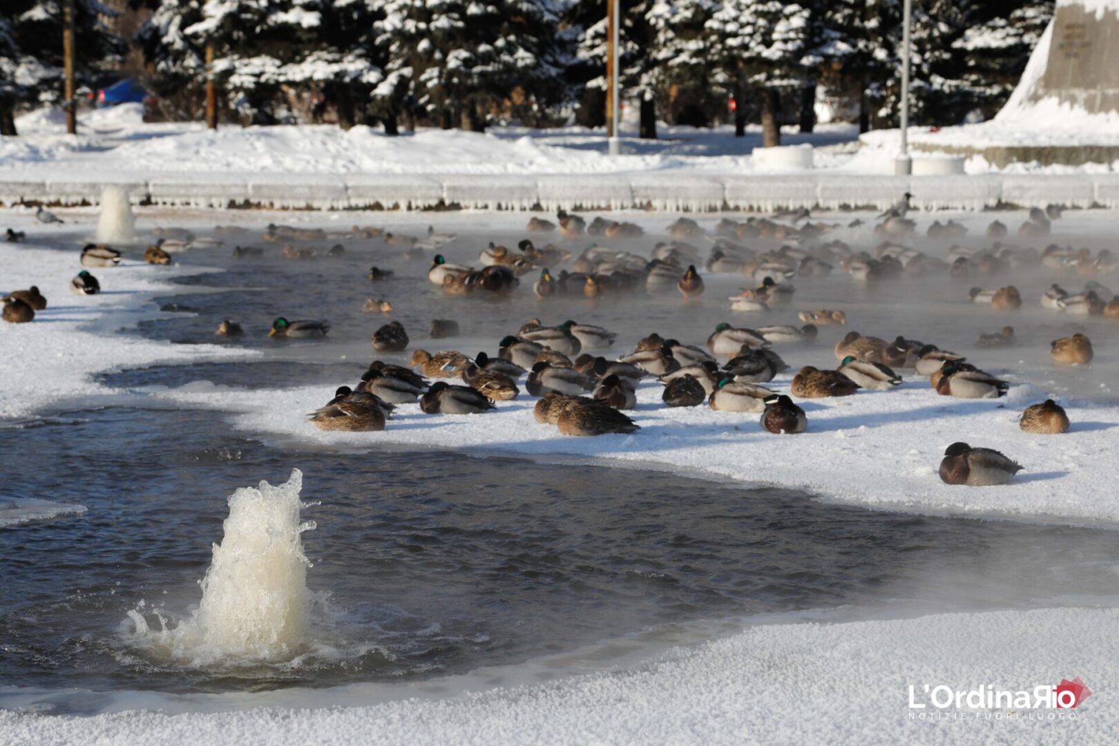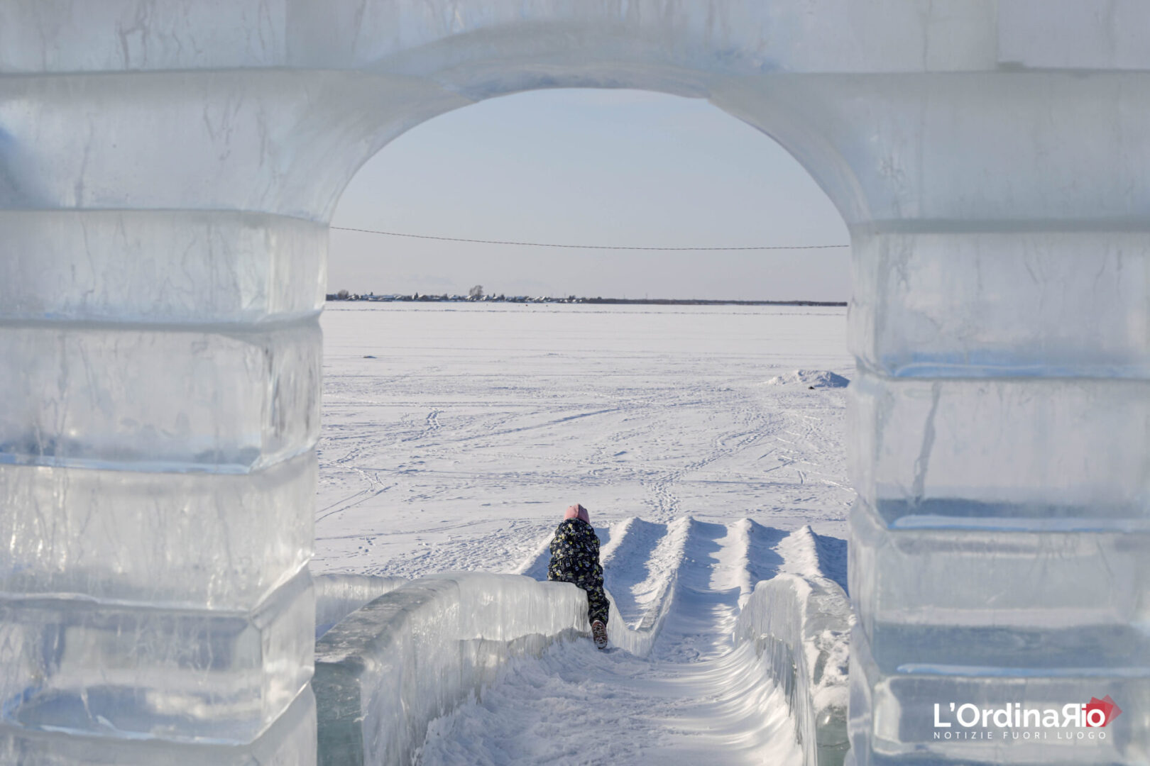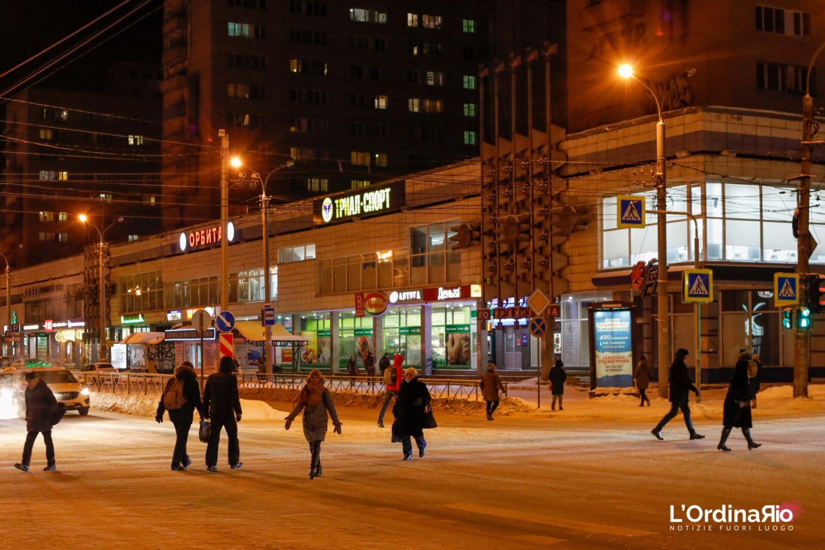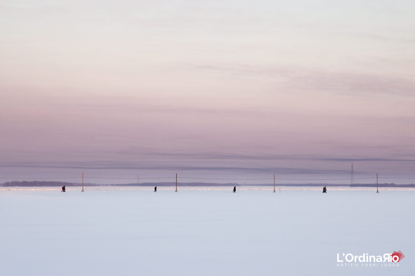 Così si conclude il mio viaggio ad Arkhangelsk, città sulla foce del fiume Dvina sul Mar Bianco, nel nord della Russia. Una settimana di sole e freddo intenso. Le temperature sono oscillate tra i -25°C e -40°C, diciamo che non si moriva dalla voglia di passare ore all’aperto nonostante il bel sole e il cielo azzurro intenso. Nonostante questo nulla mi ha impedito di fare lunghe camminate tra le strade ghiacciate della città. Ho passato ore ad osservare e sentire il ghiaccio che si muoveva sotto i miei piedi durante le traversate a piedi del fiume. La superficie è completamente ghiacciata e nei periodi invernali veicoli di vario tipo vengono usati per l’attraversamento: auto, motoslitte, moto a tre ruote tipo quelle che si vedono in estate sulla riviera romagnola e naturalmente a piedi. Percorsi controllati e illuminati sono tracciati tra la città e le isole della foce. Ora sono sul treno e il primo pensiero che mi viene in mente è: come la racconto questa città?