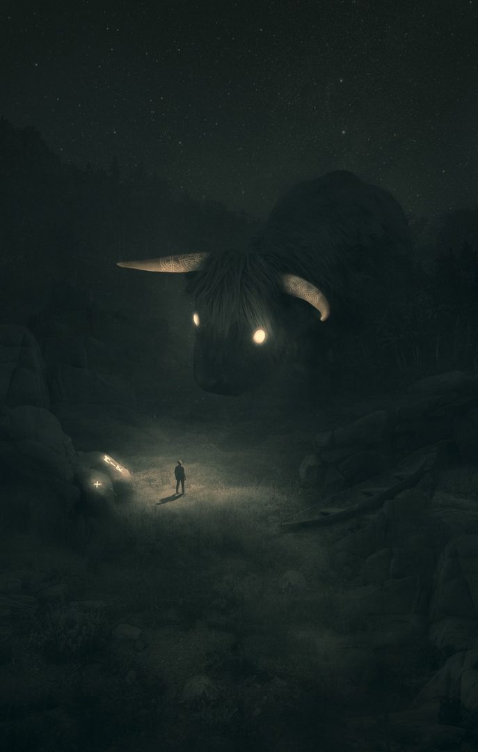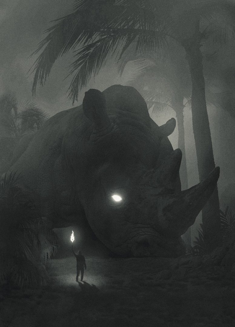 Minipeople in the jungle sono le illustrazioni visionarie, in bianco e nero, dove strane creature vagano in paesaggi notturni, e figure umane senza volto si trovano ad affrontarle: è la metafora con cui questo artista ci narra la sua lotta alla depressione. Animali mastodontici dagli occhi brillanti ed esseri umani che si avvicinano a essi, quasi a sconfiggere il terrore che provocano e a tentare di andare oltre la paura. Un modo artisticamente potente di narrare l’incontro con le proprie angosce, nelle fattezze di colossali bestie. L’attraversare un bosco immaginario, buio e nebbioso, è l’attraversare la sofferenza e l’oscurità della depressione.